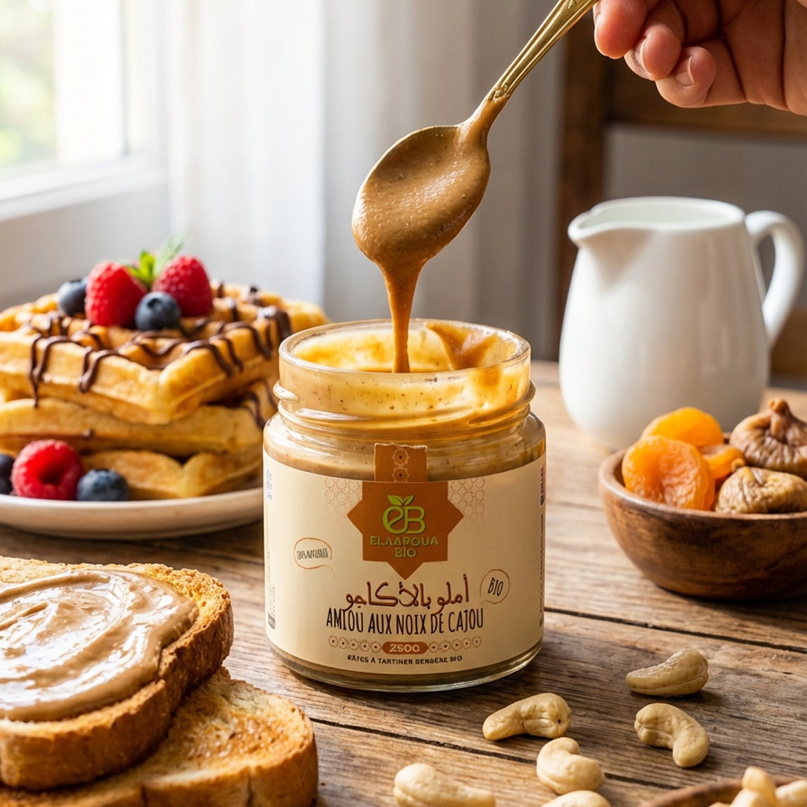 أملو بالكاجو يتميز بقوام كريمي ناعم يجمع بين الكاجو المحمص بعناية، زيت الأركان النقي، وعسل الليمون الطبيعي.