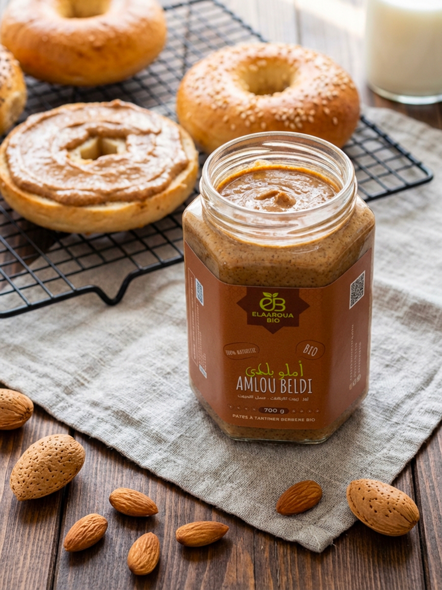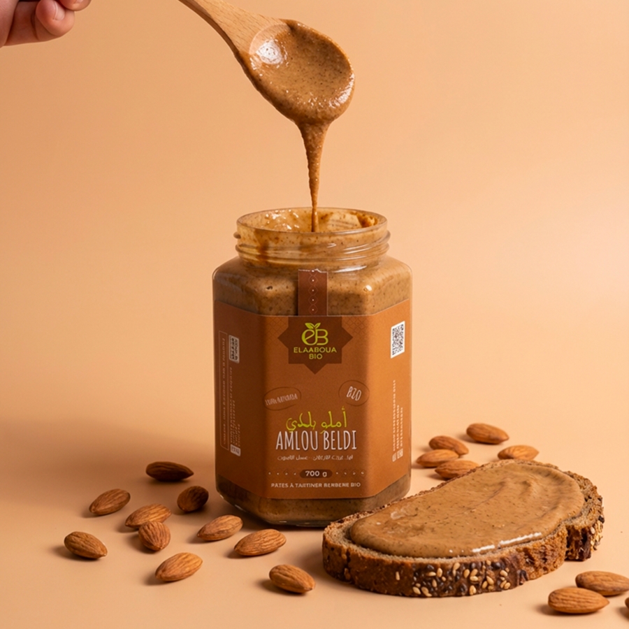 أملو بلدي باللوز يتميز بقوام كريمي ناعم وغني يجمع بين اللوز المحمص بعناية، زيت الأركان النقي، وعسل الليمون الطبيعي.